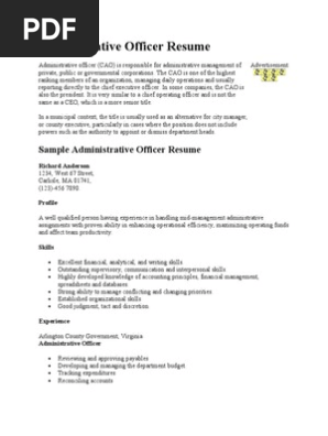 Administrative Officer Resume 1 Arlington County Chief Executive Officer : Here's A Sample Administrative Cv We Recently Administrative Officer With 5 Years Of Experience In Performing Various Administrative Functions.