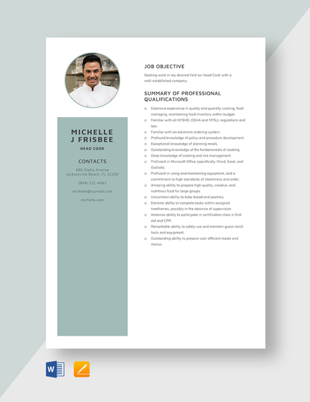 Head Cook Job Templates- Instantly Download Head Cook Resume Template, Sample & Example In Microsoft Word (Doc), Apple Pages Format.